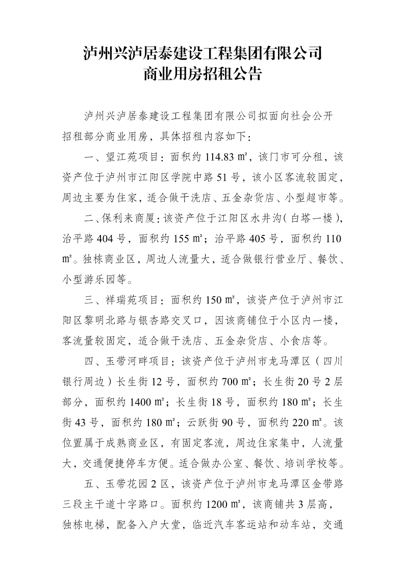 瀘州興瀘居泰建設工程集團有限公司商業用房招租公告
